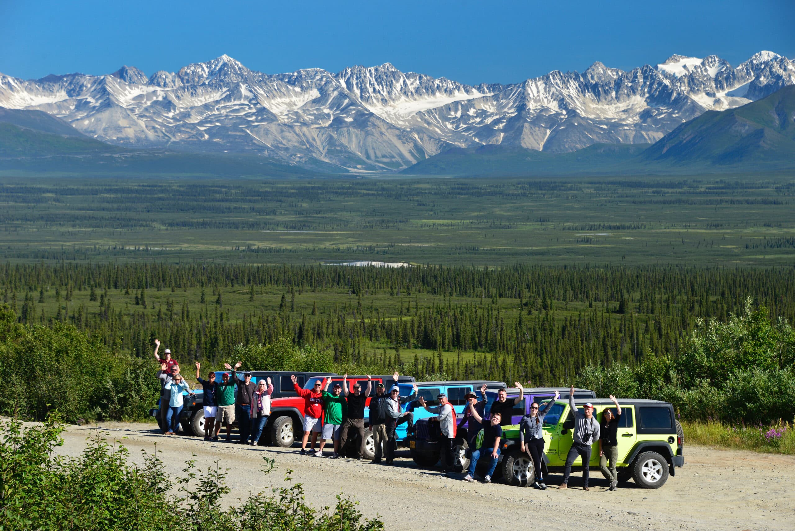 Row of colourful Jeep 4x4s with travellers waving beside a pullout; vast forested valley and snow-streaked Alaska Range under blue sky.