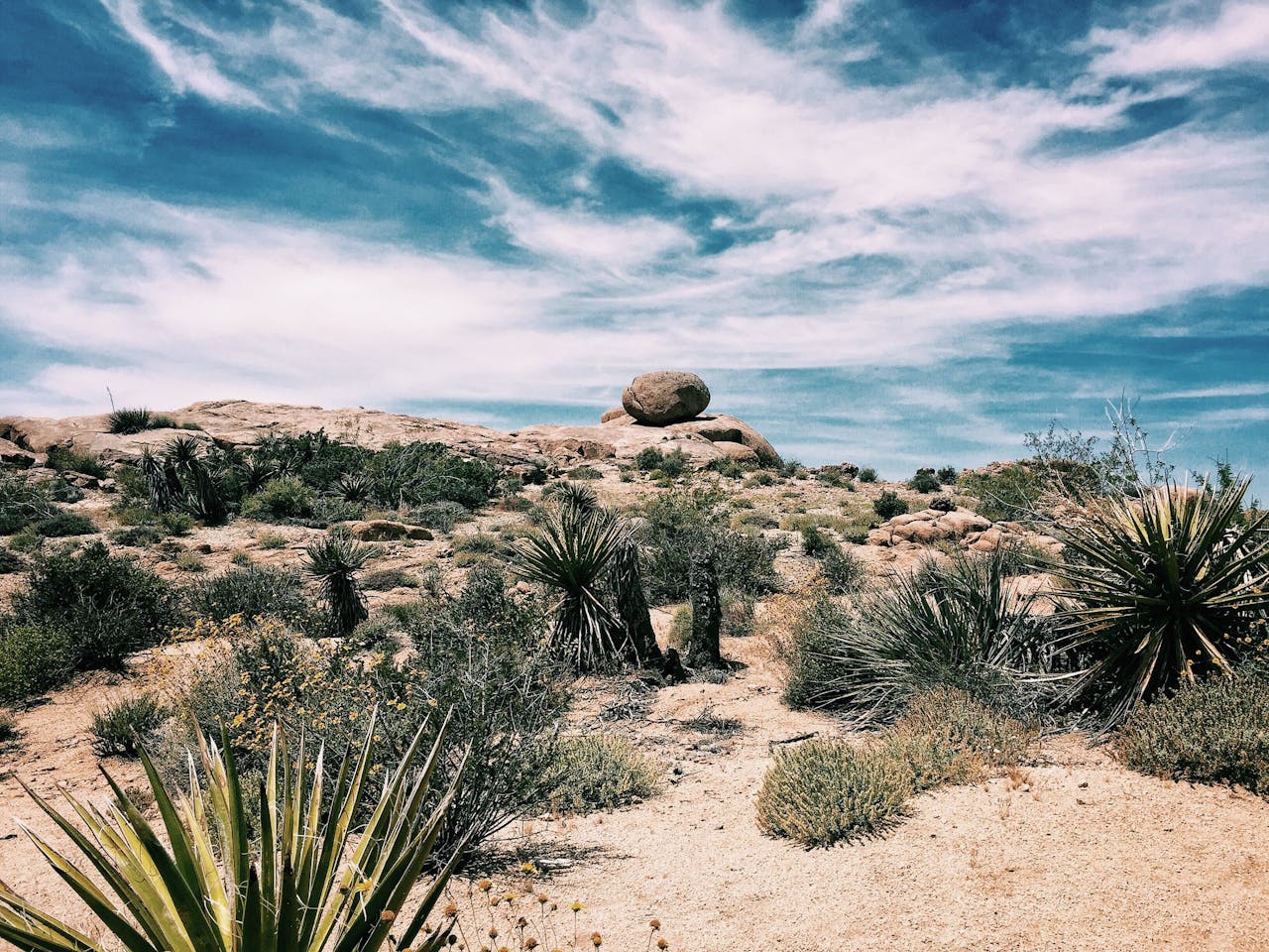 A desert landscape with rocky hills, scattered shrubs, and spiky yucca plants beneath a bright blue sky with wispy clouds.