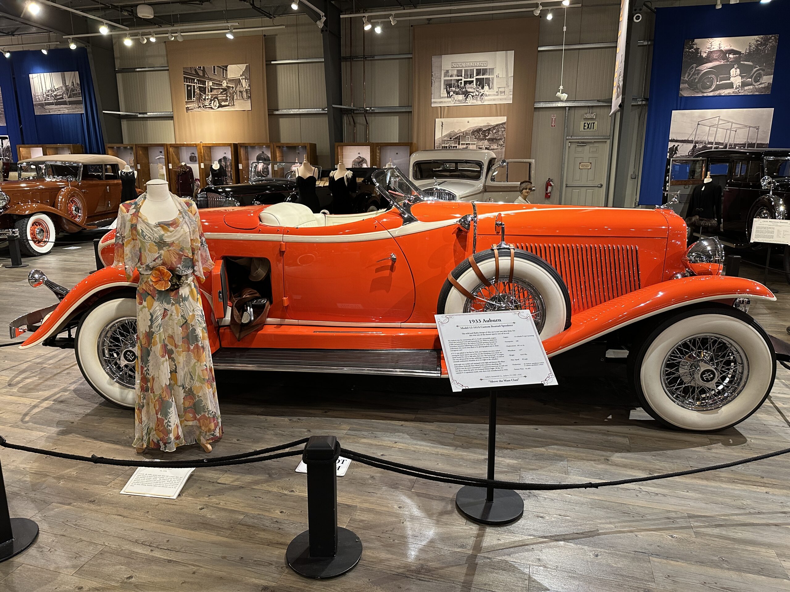 A red 1933 Auburn convertible displayed with a floral vintage dress at the Fountainhead Antique Auto Museum in Fairbanks.