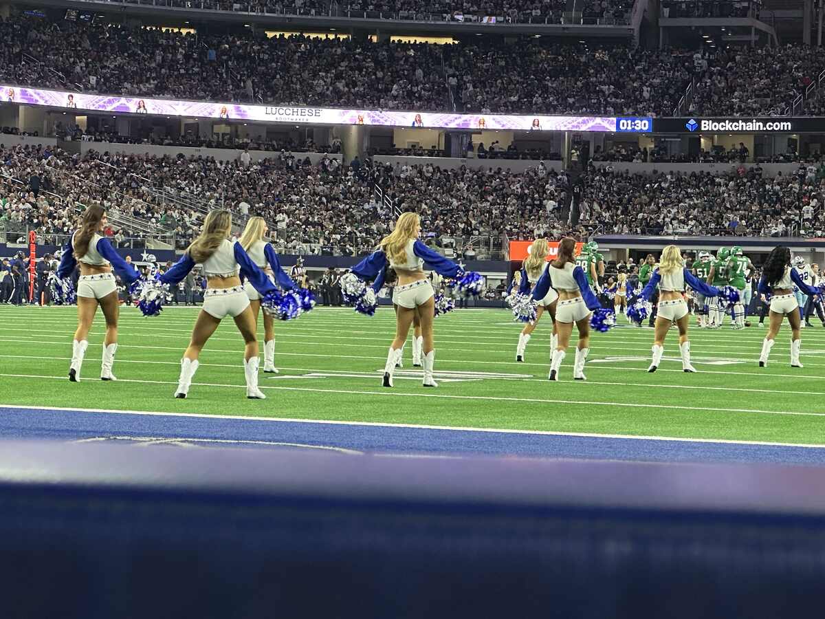 A line of Dallas Cowboys Cheerleaders performs on the field in their iconic blue-and-white uniforms and white boots, pom-poms in hand, with a full stadium of fans in the background.