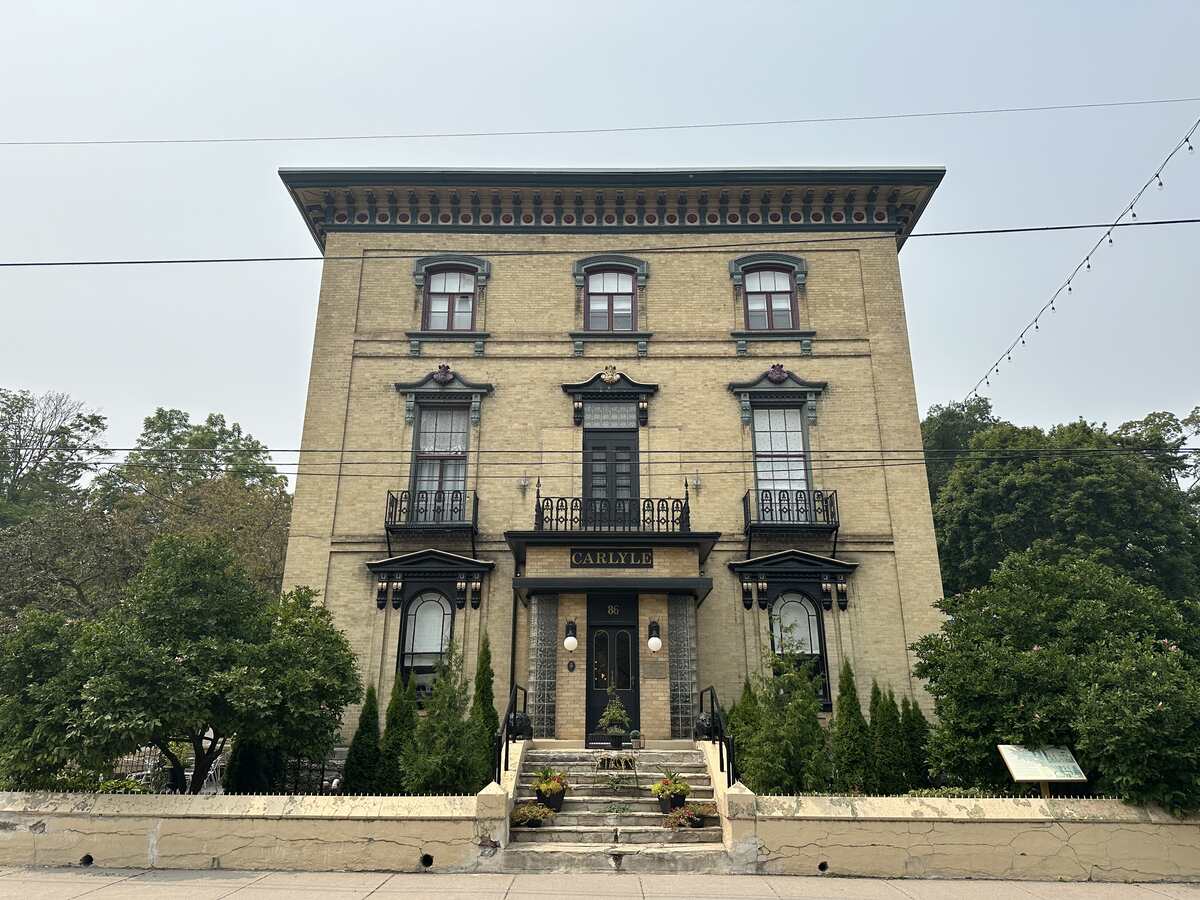 A stately three-storey building with light yellow brick and black trim, known as The Carlyle. Its grand entrance features symmetrical windows, wrought-iron balconies, and manicured greenery lining the stairs.
