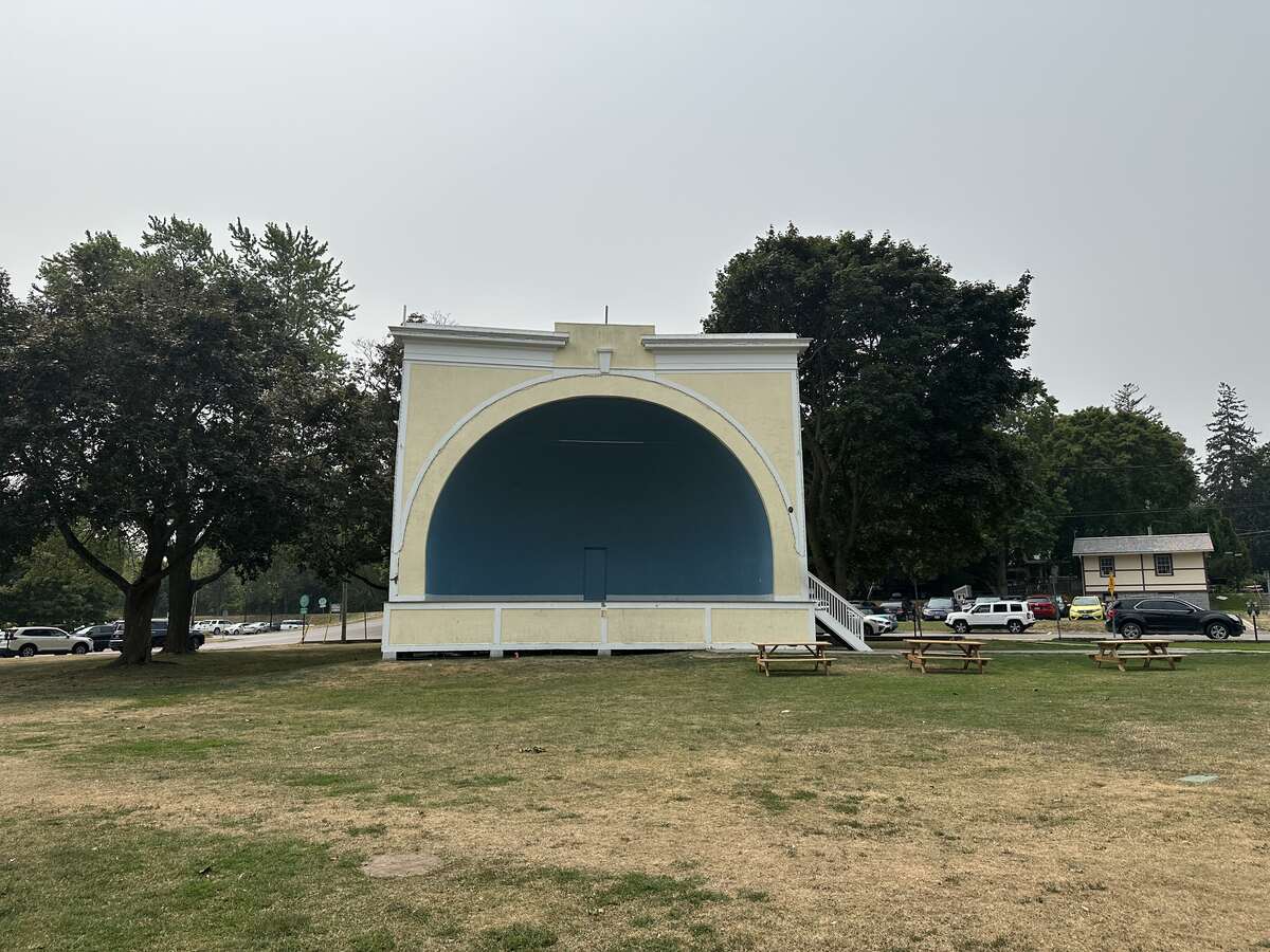 A pastel yellow outdoor bandshell with a bright blue stage, set against trees and picnic benches. The lawn in front is dry from the summer sun.