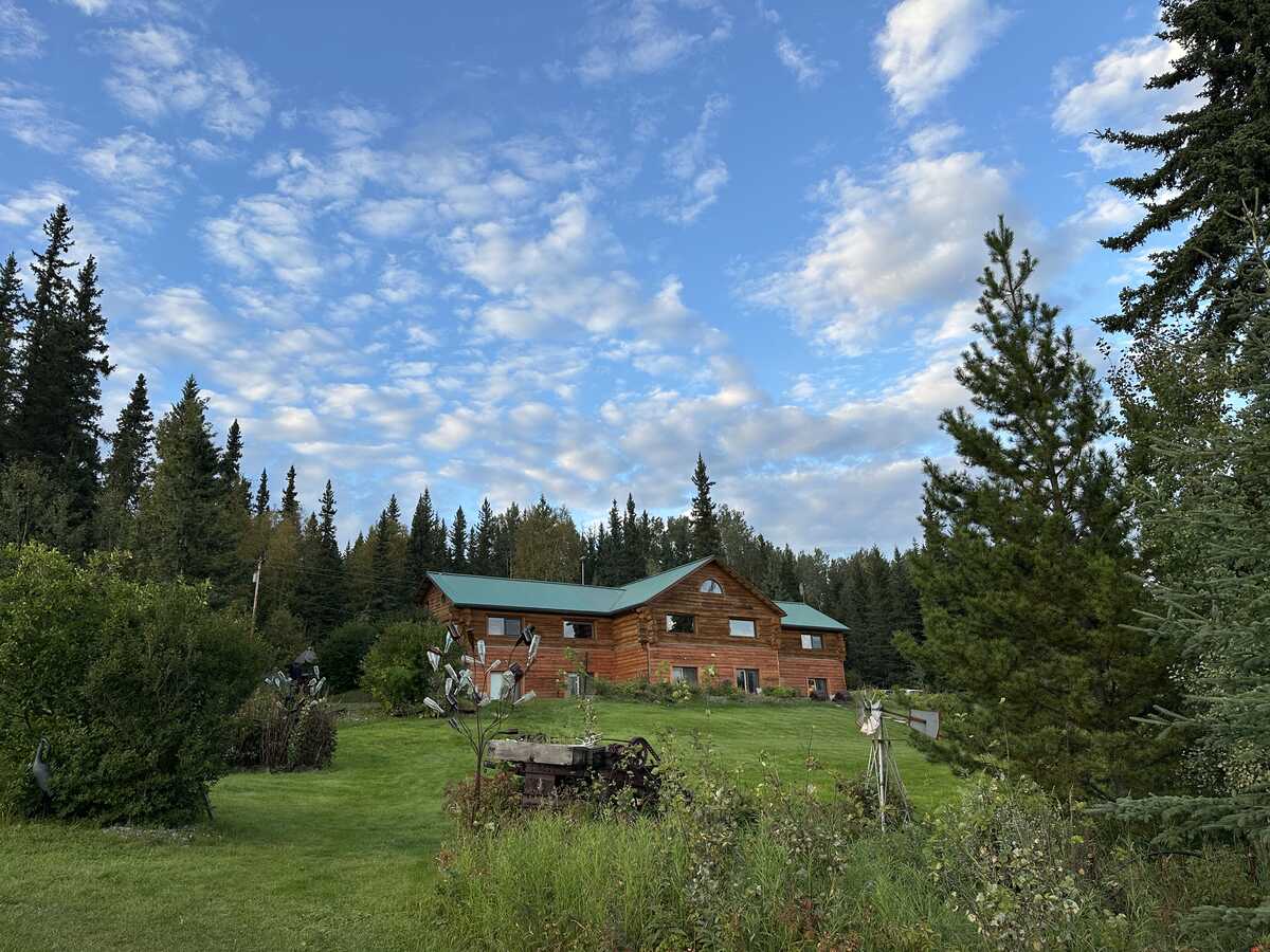 A log lodge with a green roof sits on manicured lawns under a partly cloudy blue sky, framed by trees and garden sculptures.