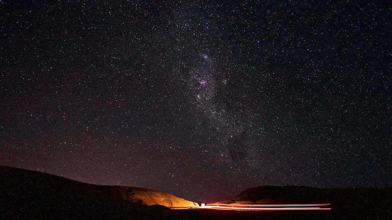 Over dark rolling hills, the Milky Way appears like a celestial river, flowing upward in silvery streaks. The night sky is alive with countless stars, while faint streaks of red and white light from cars trace along the horizon, blending human presence with the immensity of the universe.