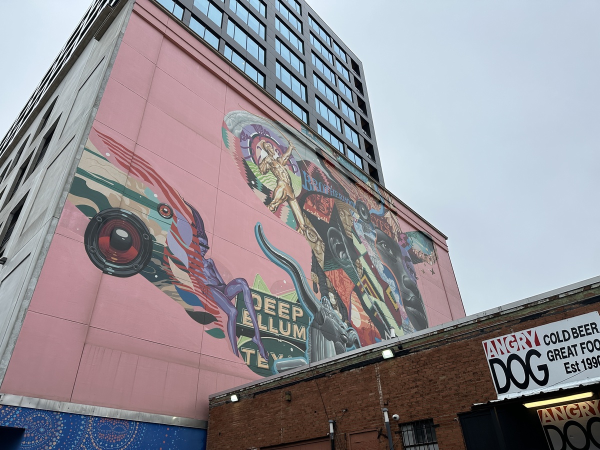 Colourful mural on a tall pink building in Deep Ellum, with musicians, abstract shapes and “Deep Ellum Texas” text above the roofline of Angry Dog.