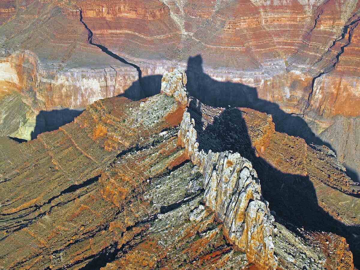 An aerial view of the Grand Canyon’s multicoloured ridges and jagged rock formations. Rich red, brown, and orange hues dominate, with the canyon’s immense depth revealed through shadow play that highlights its layered geology.