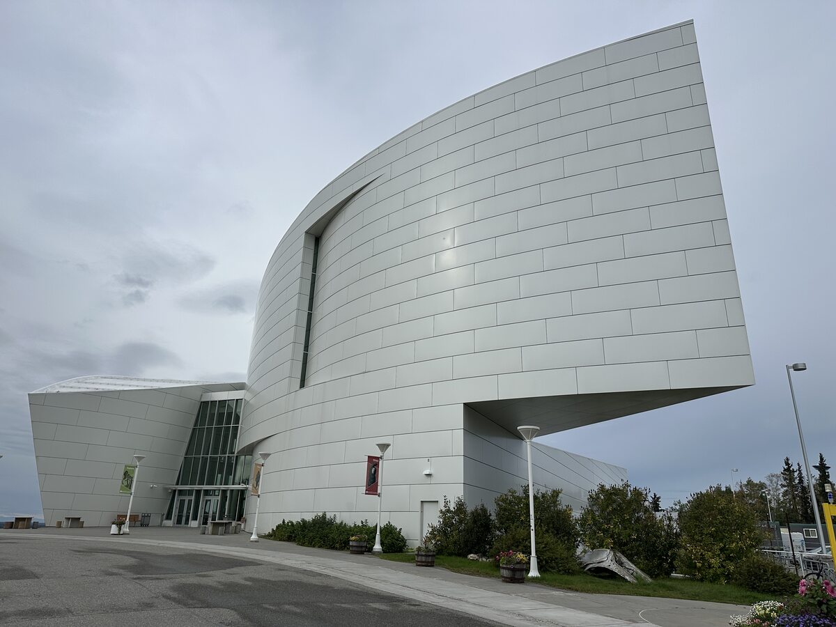 The glacier-inspired white modern building of the University of Alaska’s Museum of the North against a cloudy sky.
